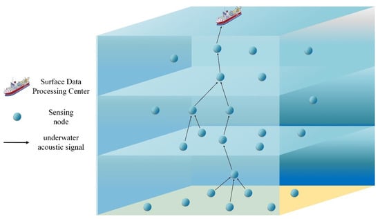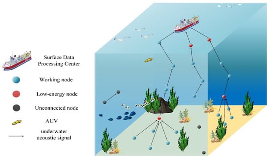 In this study, the IoUT is modeled as a three-dimensional network. Nodes in the network are randomly deployed, and it is assumed that the network is fully connected at initialization. The data collected by nodes in the network are hop-by-hop transmitted to the water surface data processing center, which is also named the sink node. As illustrated in Figure 2, the blue nodes are normal working nodes, which are connected normally and have enough energy. Their data can be transmitted to the sink. The red nodes are low-energy nodes, which work normally but may face death due to insufficient energy. The black nodes are disconnected nodes or isolated nodes. These nodes are disconnected from the network due to the drift of ocean currents or the impact of fish or other marine organisms. Hence, this study designs the MAC protocol of AUV-assisted data transmission, considering low-energy nodes or isolated nodes, and AUV is responsible for data collection to alleviate network congestion and improve network throughput.