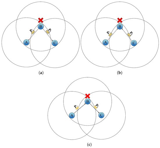 In order to design conflict-free MAC, an Interference Cancellation Graph is investigated. In this study, three types of interference are taken into account, e.g., send interference, receive interference, and send/receive interference. As illustrated in Figure 5a, node A and node C cannot send different messages to node B at the same time, which is send interference. As illustrated in Figure 5b, node B cannot send different messages to node A and node C at the same time, which is receive interference. As illustrated in Figure 5c, in half-duplex condition, node B cannot send information to node C while receiving information from node A. This is send/receive interference.