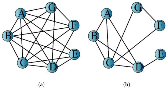 On the basis of the interference graph derived above, the vertex set V is obtained. First, the vertex with the largest p-value is selected and assigned a time slot for it in priority. Then, the vertices with no interference are added to the set S. All the vertices that have been assigned time slots are removed from the vertex set V. The above process is repeated until the vertex set V is empty. As shown in Figure 8, suppose the p-values of vertices are , the time-slot allocation process of this graph is as follows. The vertex with the largest p-value is C, and the vertex not connected to it is E. Therefore, there is no interference between C and E, and they can share the same time slot. Remove vertices C and E from the set of vertices V and add them to the set S. When the p-values of vertices are the same, a node can be randomly selected for time-slot allocation. For example, node D is selected. There is no interference between nodes G, F, and D; however, because node F has a higher priority, nodes D and F are first allocated with the same time slot. Then, continue to allocate time slot for nodes B and G. Finally, node A is left with a single time slot.