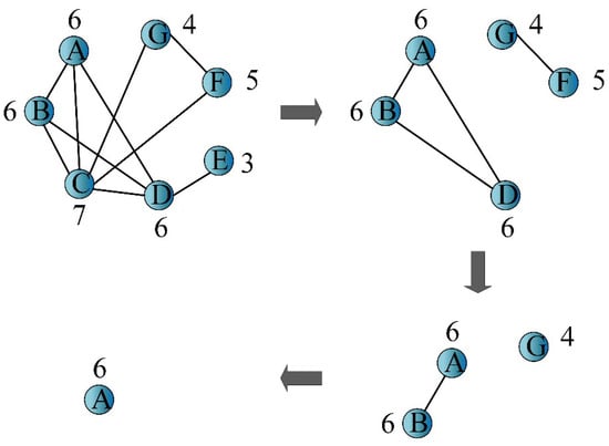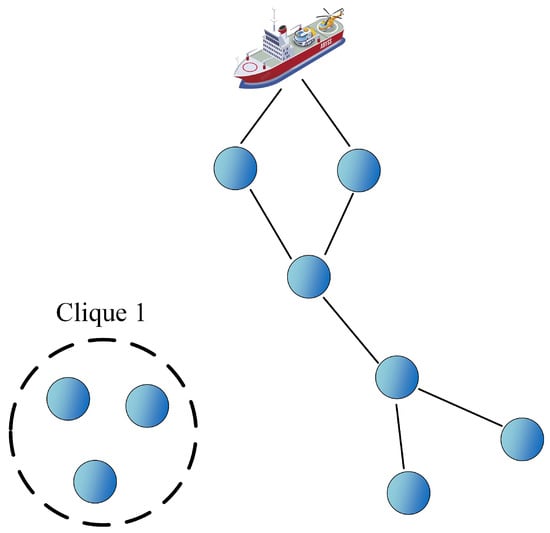 If the cut vertex is an isolated node, then the AUV can go directly to the location of the node for data collection. If the cut vertex causes several nodes to be unconnected, a clique of vertexes disengage from the original network, as shown in Figure 10. As the AUV moves to the cut clique, many vertexes need to upload data, so a conflict-free time-slot allocation mechanism is required for these nodes. In this study, all the isolated vertexes or cut cliques form the target region. The target region search needs to be performed first, and the AUV moves to the target region for data collection. In order to find the target area, the “importance” value of each node in the target area is defined by Equation (7) as follows: