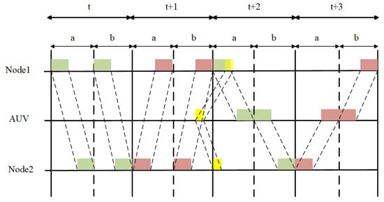 In this study, each time slot that has been allocated is further divided into two sub-time slots. When the AUV performs data collection, a notification packet is broadcast through the control channel. All nodes that receive the notification packet and have data packets to be transmitted concede one of the sub-time slots to communicate with the AUV and keep one of the sub-time slots to maintain the original data communication in the network. As shown in Figure 11, the green squares indicate the packets sent by node 1, the red squares indicate the packets sent by node 2, and the small yellow squares indicate the control packets of AUV. Before the AUV is reached, two sub-time slots are used for data transmission between nodes 1 and 2. After the AUV arrives, the notification packet is broadcast first for data set. Both nodes 1 and 2 yield the time slot denoted by a to deliver packets to the AUV and reserve the time slot denoted by b for data transmission with neighboring nodes.