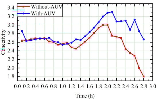 As illustrated in Figure 12, the connectivity of the networks with and without the presence of AUVs are compared. It can be observed that at the beginning, the connectivity of the networks with and without an AUV presence is similar. Over time, the connectivity of the network without an AUV gradually decreases, while the connectivity of the network with AUV assistance remains relatively smooth. This is because in the network without AUV assistance, due to factors such as ocean currents, the nodes may drift and disconnect, or die early due to excessive energy consumption, and the whole network shows regional disconnections, leading to a decrease in connectivity, whereas in the protocol proposed in this paper, the buoy calculates the location of the disconnected locations or the set of locations of nodes with too low energy and assigns the AUV to the target area for data collection, thus always maintaining high network connectivity.