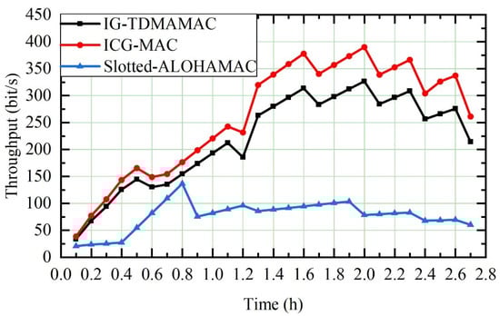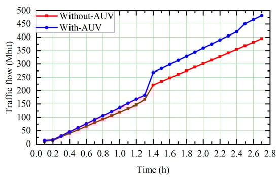 As shown in Figure 13, the ICG-MAC protocol proposed in this paper has the best performance among the three protocols, followed by the IG-TDMA MAC and the Slotted-ALOHA MAC protocol. This is due to the fact that both the proposed ICG-MAC and the IG-TDMAMAC are contention-free MAC protocols. There is no conflict between the nodes and therefore no need for retransmission, so it is more efficient. As the simulation proceeds, more and more nodes sense the data and participate in the data transmission, so the throughput increases accordingly. However, when too many nodes die, the network becomes too sparse, so the throughput gradually decreases. In addition, the proposed ICG-MAC protocol outperforms the IG-TDMAMAC protocol because the auxiliary data collection by an AUV is considered in this paper. The Slotted-ALOHAMAC protocol, on the other hand, is a contention-based protocol, which is prone to encountering hidden terminal problems during channel competition, resulting in data conflicts and packet loss, and thus has the worst performance among the three protocols. In addition, the network traffic with and without AUV assistance are compared. As shown in Figure 14, the traffic grows over time and the network with the presence of AUVs consistently outperforms the network without the presence of AUVs.