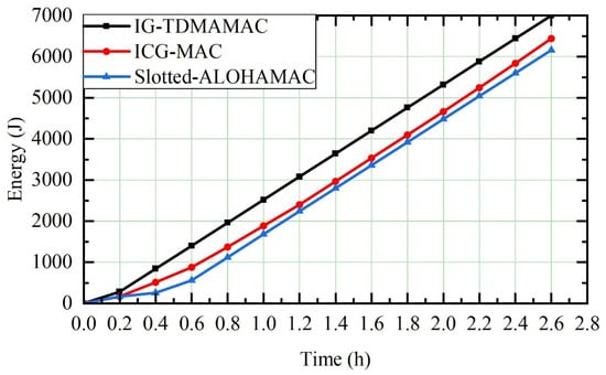 As shown in Figure 15, the IG-TDMA MAC protocol consumes the most energy among the three protocols, followed by the ICG-MAC protocol proposed in this paper, and the Slotted-ALOHAMAC protocol consumes the least energy. This is because under the competition mechanism of the Slotted-ALOHA, some nodes fail to obtain the channel usage and do not transmit data, so the network energy consumption is lower in the same time. The ICG-MAC protocol and IG-TDMAMAC protocol give the nodes sufficient opportunities to transmit, so higher energy is consumed, sacrificing some energy in exchange for the increased throughput.