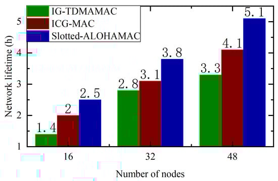 As shown in Figure 16, the network lifetime is compared. The life cycle of all three protocols grows as the number of nodes grows. Among the three protocols, the Slotted-ALOHA has the longest network lifetime, followed by the ICG-MAC proposed in this paper, and the IG-TDMAMAC protocol has the shortest network lifetime. This is due to the fact that the ICG-MAC and IG-TDMAMAC have more service traffic and therefore consume more energy in the same time, resulting in a shorter network life cycle compared to the Slotted-ALOHAMAC protocol. However, because the proposed protocol in this paper introduces an AUV to balance the energy consumption in the network and alleviate the route void problem, its network life cycle is longer than that of the IG-TDMAMAC protocol.