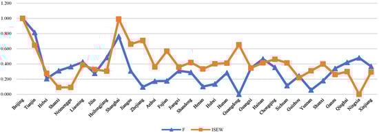 In order to explicitly compare the correlation between national quality and sustainable economic development, this paper adopted the method of 0–1 standardization to readjust the average national quality factor score and ISEW to within a range of 0–1. In doing so, a 2011–2020 Comparison Chart of National Quality and ISEW could be produced. Only the 2011 comparison chart is shown here. Based on Figure 1, was found that there is a strong correlation between national quality and ISEW in 2011. Areas with a higher level of national quality, such as Beijing and Shanghai, reflect stronger capabilities for sustainable economic development. By contrast, provinces with a lower level, such as Hebei and Jilin, demonstrate weaker capabilities.