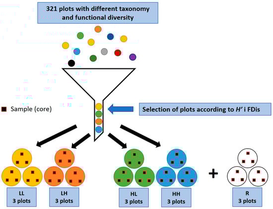 Based on the H′ index and FDis values, 12 unreclaimed plots were selected among those recorded in the field investigation. The vegetation plots were chosen to represent four combinations of taxonomical and functional diversity: 3 plots were characterised by high taxonomic and functional diversity (HH), 3 plots by high taxonomic and low functional diversity (HL), 3 plots by low taxonomic and high functional diversity (LH), and 3 plots by low taxonomic and functional diversity (LL). The H′ index values ranged from 0.68 to 1.84, while for FDis from 0.18 to 0.35 in the selected plots. According to these ranges, we considered the diversity values as follows: for taxonomic diversity, values of the H′ index higher than 1.5 were considered high, while values below 1.3 were considered low. For functional diversity, FDis values higher than 0.32 were considered high, while FDis values lower than 0.30 were considered low (see Table 1). Additionally, 3 plots were established on the reclaimed heap (R), to serve as a comparison between the two types of management (unreclaimed and reclaimed). In total, 15 plots with the shape of a circle (3 m radius), divided into five categories (the four combinations of taxonomic-functional diversity plus the group of reclaimed plots) were available for sampling. A diagram summarizing the selection of the 15 test plots is shown in Figure 1. For each combination of taxonomic and functional diversity, the selected plots differed significantly in H′ and FDis indices. These differences were tested by Permutational ANOVA and Approximative (Monte Carlo) Nemenyi–Damico–Wolfe–Dunn test for multiple comparisons.