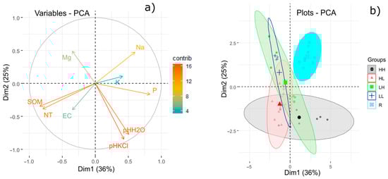 Principal Components Analysis of soil variables: contribution of studied soil parameters (a) and ordination of plots along the first two components (b). Abbreviations: HH—high taxonomical and functional diversity; HL—high taxonomical and low functional diversity; LH—low taxonomical and high functional diversity; LL—low taxonomical and functional diversity; R—reclaimed plots.