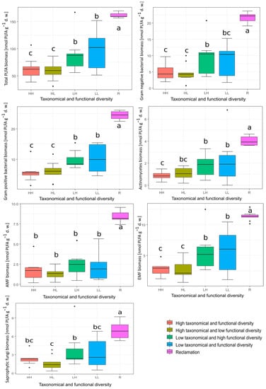 Comparison in PLFA biomass (nmol PLFA g−1 d.w.) parameters among levels of taxonomical and functional diversity (Kruskal–Wallis’s chi-squared test). The values (medians ± quartile range and dots showing outliers) with the same letter do not differ at p < 0.05. Abbreviations: HH—high taxonomical and functional diversity; HL—high taxonomical and low functional diversity; LH—low taxonomical and high functional diversity; LL—low taxonomical and functional diversity; R—reclaimed plots.