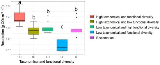 Comparison of soil respiration among levels of taxonomical and functional diversity (Kruskal–Wallis chi-squared test). The values (medians ± quartile range and dots showing outliers) with the same letter do not differ at p < 0.05. Abbreviations: HH—high taxonomical and functional diversity; HL—high taxonomical and low functional diversity; LH—low taxonomical and high functional diversity; LL—low taxonomical and functional diversity; R—reclaimed plots.