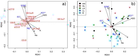 The RDA analysis showing relationships between PLFA and environmental variables (a,b), including four significant ones * p < 0.05, ** p < 0.01 based on a permutation test. (a) Biplot showing PFLA profiles and environmental factors; (b) biplot showing categories of plots and environmental factors. Abbreviations: HH—high taxonomical and functional diversity; HL—high taxonomical and low functional diversity; LH—low taxonomical and high functional diversity; LL—low taxonomical and functional diversity; R—reclaimed plots.
