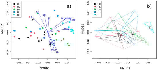 (a) The passive projection of explanatory variables onto NMDS ordination based on PLFAs showing only significant variables; (b) distance between centroids of the different categories of plots representing different combinations of taxonomic and functional diversity in multi-dimensional Euclidean space. Explanations: (1) HH—high taxonomical and functional diversity; (2) HL—high taxonomical and low functional diversity; (3) LH—low taxonomical and high functional diversity; (4) LL—low taxonomical and functional diversity; (5) R—reclaimed plots. H′—Shannon–Wiener index; D—Simpson dominance index; DS—Margalef diversity index; E—Evenness; G+, G−—Gram-positive or Gram-negative bacterial biomass; iso.anteiso—iso/anteiso nutrient stress marker; i15/a15, i15:0 + i17:0/a 15:0 + a17:0— nutrient stress marker; Resp—soil respiration; AMF—arbuscular mycorrhizal fungi biomass; Actin.—Actinomycetes biomass.