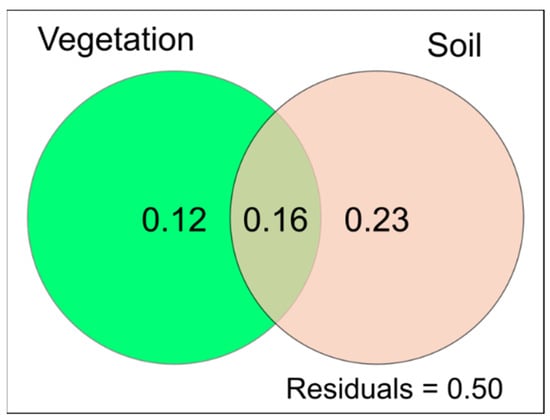 According to the Venn diagram (Figure 7) showing the variance partition explaining microbial biomass, substrate parameters accounted for 23% (adjusted r2 = 0.52), vegetation diversity for 12% (adjusted r2 = 0.8), and interactions between the two for 16% (adjusted r2 = 0.50) of microbial biomass.