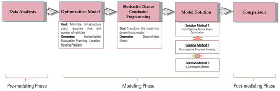 The research methodology is displayed in Figure 2. In the first step, the fundamental infrastructures that will be affected by a typhoon are identified, and their interactions are established. The stochastic parameter distribution functions are then generated. The mathematical model for the pre- and post-disaster phases is presented in the second stage. In order to minimize costs, response times, and maximize vehicle usage, the location, allocation, and routing must be planned. The proposed stochastic mathematical model is then translated to a deterministic model as the next stage. Finally, MOPSO is used to solve and optimize the model. MOPSO’s solutions are evaluated with those of multi-objective simulated annealing (MOSA) and the -constraint approach. The Multi-Objective Simulated Annealing (MOSA) approach is a subset of simulated annealing extensions to multi-objective optimization that builds an estimated Pareto front by assembling nondominated solutions discovered while examining the feasible domain. An archive is seen as being used to maintain such effective solutions [35]. The ε-constrained method is an algorithm transformation technique that can change algorithms for unconstrained problems into algorithms for constrained problems by comparing search points based on their objective values and violations of constraints at the epsilon level [36].