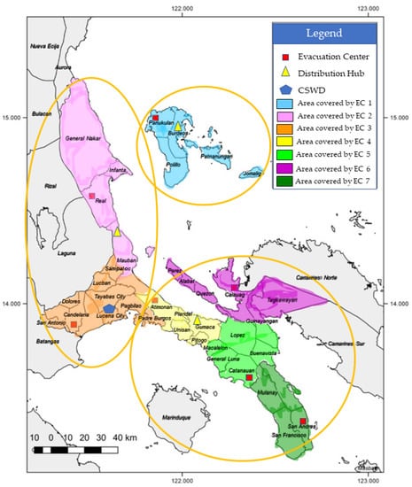 Despite the availability of many research studies related to humanitarian supply chains and humanitarian network designs, topics on facility location, network design, and evacuation planning are each dealt with separately, when in fact they should be treated with high degree of inclusivity. Also, the majority of models created to quantify decisions made in relation to evacuation travel take place in developed nations, where decision-making factors such as culture, capacity, and resources are different from those in developing nations [10]. Furthermore, very limited studies have been conducted in the Philippines on these topics. The majority of the literature on humanitarian logistics in the Philippines is concerned with the sustainability of the humanitarian supply chain, in general, as well as the study of evacuation travel behavior [10,11,12,13]. Gutierrez and Mutuc [14] proposed a model for humanitarian supply chain in Marikina City using linear programming, employing the Center of Gravity Method. Though the Center of Gravity Method locates the facilities where it displays similarity between volume and distance of demand throughout a network of consumer locations. Its application is limited to regions with no bodies of water. Further, it only considers the location of distribution hubs, not the location of evacuation centers or temporary shelters. This investigation was conducted under this framework. The number and location of local distribution centers must be decided upon before the start of the disaster. This pre-positioning action is a component of disaster preparedness [15]. At the same time, evacuation centers (or temporary shelters) and their locations need to be taken into account because they act as places where evacuees can get food, medical attention, and lodging [16]. These two facilities should be taken into account during the pre-disaster phase. In order to assist in pre-disaster preparation, the study establishes the number of distribution and evacuation centers as well as their locations depending on the context in the Philippine conditions.