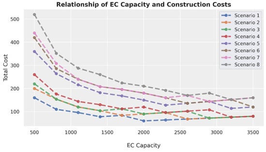 A sensitivity analysis is carried out to determine how sensitive the infrastructure cost is to EC capacity. The capacity affects the number of ECs that must be built, as can be drawn from Table 6. The capacity expansion of one EC prevents the creation of a new EC. Consequently, the construction’s fixed costs will decrease.