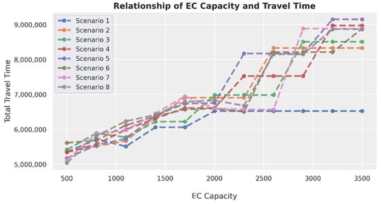 Figure 7 shows the sensitivity analysis of the network’s overall travel time EC capacity. Because there will be fewer ECs dispersed throughout the network, as was already mentioned, the travel time increases as the number of ECs increase.