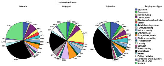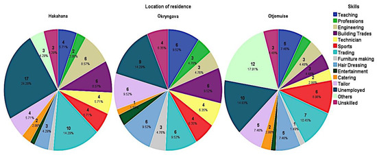 Employment and skills profiles show the sectors where the residents can be helpful in the co-production and management of public services. The employment and skills profile cuts across the different skills, as shown in Figure 5 and Figure 6. Regarding the respondents’ employment status, many were unemployed; 28.6% in Hakahana, 17.5% in Okuryangava, and 39% in Otjomuise. Moreover, a sizeable number of residents were students; 23% in Hakahana, 9.5% in Okuryaganva, and about 6% in Otjomuise. Some were in education: 5.7% in Hakahana, 3% in Okuryangava, and 8.9% in Otjomuise; or in construction: 7% in Hakahana, 4.76% in Okraganva, and 4.5% in Otjomuise. Some were in food, drinks, and hotels; 3% in Hakahana, 8% in Okuryangava and 4.5% in Otjomuise. Some were in commerce, with 4.7% from Okuryangava, and 13% were in IT/auto mechanics/electrical. Concerning their skills profiles, most of them were unemployed; 24% in Hakahana and 14% in Okuryangava and Otjomuise, respectively. Traders were 14% in Hakahana, 9.5% in Okuryangava, and 11% in Otjomuise. Those in trades were 9% in Hakahana, 9.5% in Okuryangava, and 4.5% in Otjomuise. Some were in sports, with 6% in Hakahana and Okuryangava and 9% in Otjomuise. About 6% were technicians in Hakahana and Okuryangava and 3% in Otjomuise. In Hakahana, 6% were teachers, as were 9.5% in Okuryangava and 7.5% in Otjomuise. Many were in entertainment in Hakahana. Some were tailors in Hakahana (5.7%), as were 9.5% in Okuryangava and 7.5% in Otjomuise. These profiles indicate the need for training regarding skills that can be used for co-production services in these communities. Since many are unemployed, engaging them in social enterprises would create jobs.