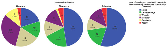 Community participation is essential for the management of public services. The community can act as an enterprise when its participants work collaboratively to produce and exchange goods and services from the existing social structure of the community for organising those activities [86]. In Okuryangava and Otjomuise, most residents do not meet with the community to discuss community needs. In Hakahana, most of the residents meet monthly. This could be because this suburb is managed by the Shack Dwellers Association of Namibia, which puts communities in a learning exchange to learn best practices. Residents are encouraged to work together, as shown in the interview with an official. They train people for cohesion in providing housing. Community information supports groups through WhatsApp, community leaders, and national facilitators communicating with the community. Through community participation, they are given opportunities to scale up the development of the land (Figure 7).
