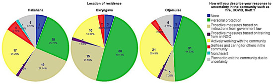 Xu et al. [87] identified residents’ coping styles with the risk posed by a disaster, including the variables found in Figure 8. In the three locations, the response is mainly through personal protection. This is followed by measures based on the community; 30% in Otjomuise, 24% in Hakahana, and 16% in Okuryangava. Another standard measure is that of government legislation; 27% in Hakahana, 25% in Okuryangava, and 7% in Otjomuise. Some preferred responding by planning to exit the community; 9% in both Hakahana and Otjomuise. The more recent exposure to uncertainty was during the COVID-19 pandemic; for example, the Shack Dwellers Association trained the community to comply with government legislation on disaster prevention in partnership with the Ministry of Health. The legislation to control the pandemic in Namibia is a declaration of a state of emergency: National disaster (COVID-19) Proclamation 7 of 2020. To be resilient, the association assists with more inclusive participation, and because it works with the community, it is easy to identify vulnerable people. It obtains information from the Ministry of Health in the local language to assist with managing the pandemic in the community.