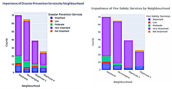 Table 2 shows access to basic facilities such as water, roads, toilets, waste management, housing, telecommunication, and internet facilities. Figure 9 further shows the facilities available in the communities. The residents’ responses also included markets, since market facilities are close to the suburbs. Fire safety and disaster prevention had low access and were rated as high in importance (Figure 10). This also shows lapses in the urban resilience structures of the communities. Despite the opportunities for tourism and the use of green spaces, as Windhoek is a city for tourists [89], there is no access to tourism or green space facilities in the neighbourhoods studied.