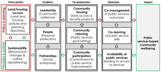 - Adewunmi, Y.; Chigbu, U.E.; Mwando, S.; Kahireke, U. Entrepreneurship role in the co-production of public services in informal settlements—A scoping review. Land Use Policy 2023, 125, 106479. [Google Scholar] [CrossRef]