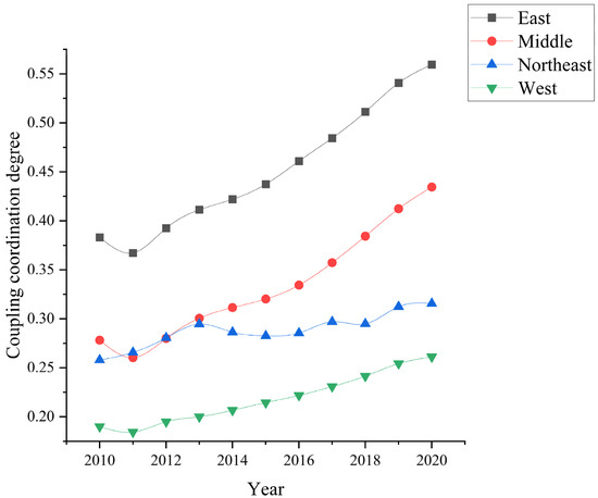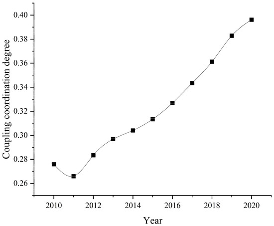 The concept of “coupling” originated in the field of physics, which refers to the dynamic process in which two or more systems interact and tend to coordinate [37]. The more connections among different systems, the higher their correlation, and the closer they are to a balanced and coordinated state [38]. At present, the CCD model has been widely used in multidisciplinary fields to reveal the internal relations and dynamic evolution process among systems, such as green urbanization system and green financial system [39], urban economic-social-environmental system [40], and so on.