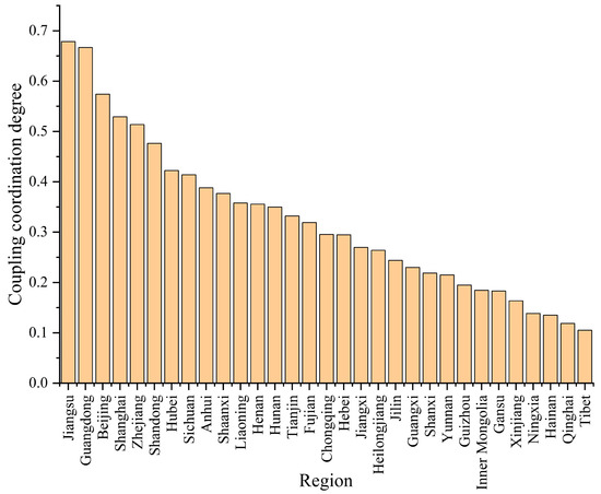 From the corresponding situations of 31 provinces and cities, there are great differences in the CCD of triple helix among different provinces and cities, as shown in Figure 2. The average CCD of triple helix among provinces and cities is 0.323, which is higher than the average level in 14 provinces and cities and lower than the average level in 17 provinces and cities. After calculation, the CCD of triple helix of Jiangsu and Guangdong is close and obviously higher than that of other provinces and cities, with Jiangsu being 0.678 and Guangdong being 0.667, and their GIU systems have reached the primary coordination state. The CCD of triple helix in Beijing, Shanghai and Zhejiang is in the range of [0.5, 0.6), which represents a reluctant coordination state. The GIU systems of the above-mentioned five provinces and cities have reached a coordination state, and different systems are closely related, forming an effective synergy. In contrast, the CCD of triple helix in other provinces and cities is lower than 0.5, which indicates that there are different degrees of imbalance in GIU systems. Therein, the CCD of triple helix in Shandong, Hubei and Sichuan is within [0.4, 0.5), and the system of GIU is on the verge of imbalance. The CCD of triple helix in Anhui, Shaanxi, Liaoning, Henan, Hunan, Tianjin and Fujian is within [0.3, 0.4), and the GIU system is facing a mild imbalance state. The CCD of triple helix in Chongqing, Hebei, Jiangxi, Heilongjiang, Jilin, Guangxi, Shaanxi and Yunnan is within [0.2, 0.3), and the GIU system presents a moderate imbalance state. The CCD of triple helix in Guizhou, Inner Mongolia, Gansu, Xinjiang, Ningxia, Hainan, Qinghai and Tibet is maintained in the range of [0.1, 0.2), and the system of GIU is severely imbalanced.