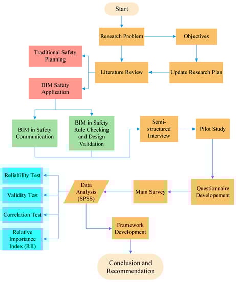 The goals of the study and the challenges associated with construction projects in terms of health and safety have been determined. A literature survey was carried out to better comprehend BIM and its current adaptability and safety use in the research and building construction industries. From the literature research, assessment questions were devised to gauge how the specialists in building construction projects evaluate BIM in terms of safety. Additionally, it was established how BIM was used in building construction projects for safety purposes. The second phase of the research involved developing and creating a questionnaire. Pilot research was conducted to assess the respondents’ degree of understanding of the prepared questionnaire. Finally, the data were descriptively analysed using the statistical packages for social sciences (SPSS) programme to assess reliability, validity, and correlation. In addition to statistical analysis, Microsoft Excel was used to generate the relative importance index (RII). To verify the F-distribution for the null hypothesis, the F-test was run. Figure 1 depicts the progression of the study to its conclusion.