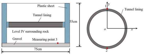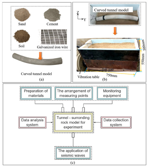 Experimentation is the most direct method, and the results of full-scale experiments are relatively reliable. In this regard, most of the experiments have been conducted to verify the stability and safety of the designed tunnel structures under specific ground conditions and surrounding soil pressure. For example, Gong [6] used triaxial experiments to simulate the failure process and mechanism of tunnel vaults. Xie [7] conducted resonant column experiments to verify the matching of acceleration similarity ratios of various parts of the structure–soil–tunnel interaction system and realistically recovered the dynamic response of the whole system under earthquake. Wang [8] recovered the actual working conditions on site through large shaking table model experiments and verified the correctness of the analytical solution of strain at the entrance of the mountain tunnel by elastic wave theory.
