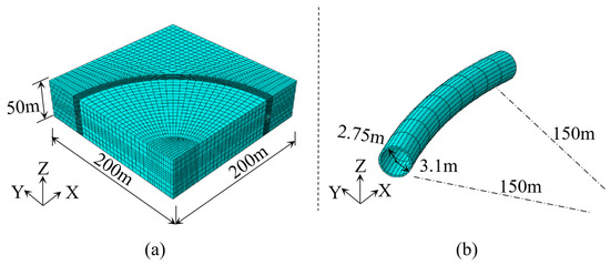As shown in Figure 7, the rock layer around the tunnel should be 5–8 times the tunnel radius, according to the specification. The surrounding rock layer exceeding three times the tunnel’s diameter has little effect on the seismic loading of the tunnel. The length, width, and height of the model are 200 m, 200 m, and 50 m, respectively. The curved tunnel has a turning radius of 150 m and a turning angle of 90 degrees.