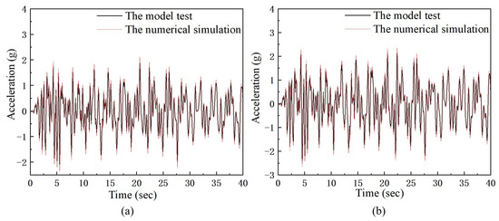 The accelerations at measurement points 1 and 2 are shown in Figure 8. By comparing the acceleration of the vault with the acceleration of the model experiment point, the error of the experimental results is less than 5%, and the simulation results can accurately reflect the experimental phenomenon. The experimental data are consistent with the numerical simulation results, indicating that the numerical simulation results are correct.