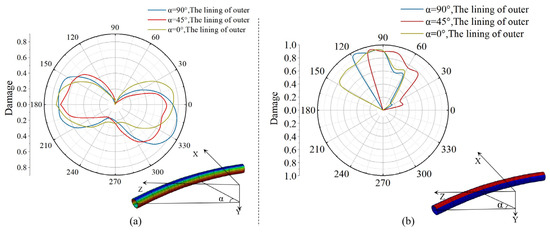 Damage diagram of curved tunnel. (a) Compressive damage; (b) tensile damage.