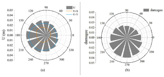 Because steel bars are used in conjunction with concrete, whose compressive strength is far greater than its tensile strength, each material will play to its fullest potential. As a result, the examination of concrete damage focuses primarily on compressive damage. According to Figure 10, the compressive damage and displacement response patterns of the curved tunnel are consistent.