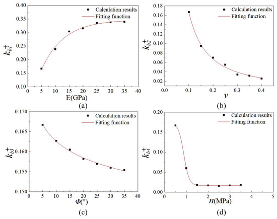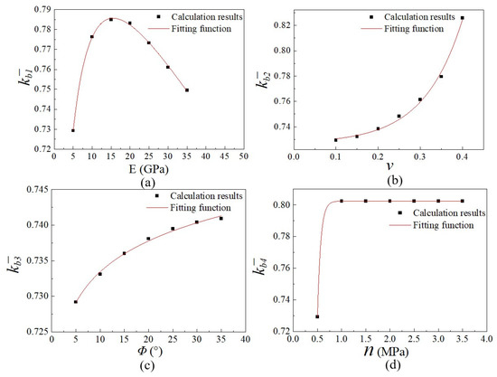 Table 4 lists the relationship between each variable (modulus of elasticity , Poisson’s ratio , friction angle , cohesion ) and . Changes in several variables leads to change, which means that is different from these variables in the sensitivities, which requires more in-depth research.