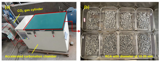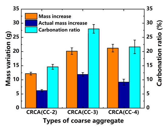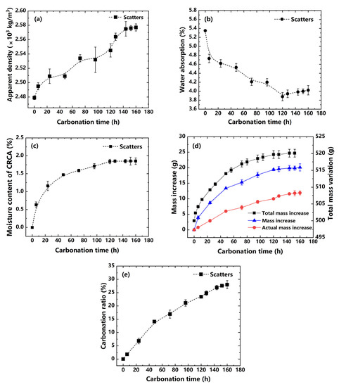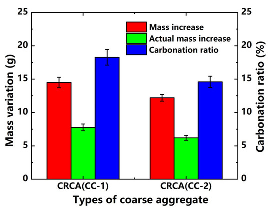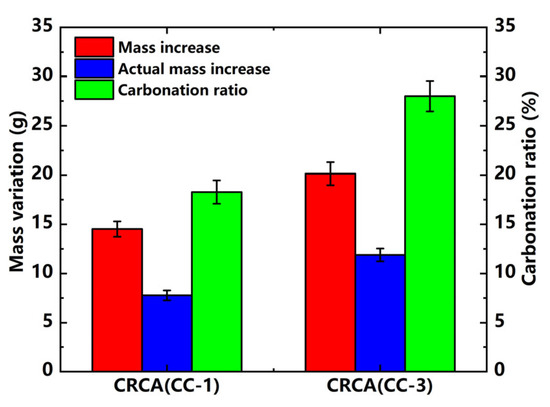 - The carbonation chamber was turned on and the accelerated carbonation treatment experiment for RCA samples was carried out under the carbonation curing conditions listed in Table 2. During this process, the mass variations of each RCA sample were tested after certain intervals of carbonation time, and these intervals occurred more frequently at the beginning of carbonation until the masses of RCA samples remained essentially constant, at which point the carbonation was stopped and the test terminated.