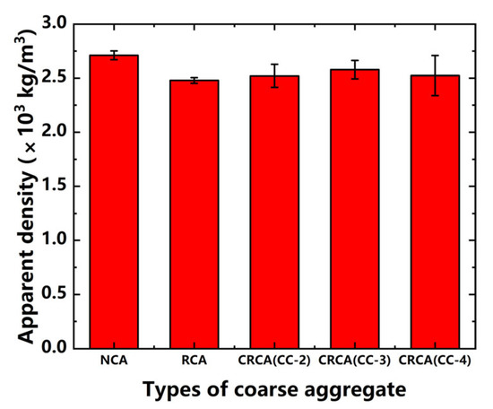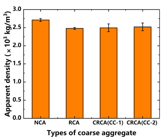 - The normalized apparent density of CRCA at arbitrary tn: ρa(n)(tn) = ρa(tn)/ρa(RCA), where ρa(tn) is the apparent density of CRCA at arbitrary tn, ρa(RCA) is the apparent density of RCA, and ρa(RCA) = 2479 kg/m3.