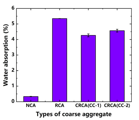 - Regarding the water absorption of RCA after accelerated carbonation, the higher the CO2 concentration (CC-1) and RH = 70% (CC-3), the better the water absorption of RCA can be reduced.