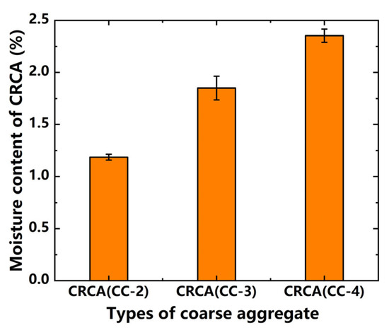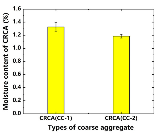 - After the RCA samples completed carbonation, the three parallel RCA samples were immediately transferred to a drying oven at 105 °C and dried to a constant weight, and the mass of each sample was weighed in order to determine the moisture content and carbonation ratio of carbonated recycled coarse aggregate (CRCA). The three parallel samples were subsequently thoroughly mixed and re-divided into three parallel samples to measure the apparent density and water absorption of CRCA, as detailed in Section 2.3.