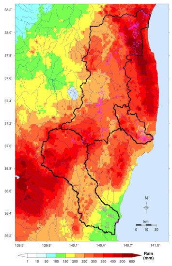 On 12–13 October 2019, Typhoon Hagibis caused extreme rain resulting in heavy flooding in Japan. It was the strongest typhoon to strike mainland Japan in decades, and it resulted in the collapse of 140 embankments along more than 70 rivers across the country [29], as well as 98 fatalities and severe damage to over 80,000 homes [30]. It also substantially damaged the Tohoku, Kanto, Hokuriku, and Chubu regions, with a population of approximately 43 million, representing one-third of Japan’s total population. Several areas of the river basins were severely flooded during the event. As a case study to answer the above-mentioned questions, we selected the Abukuma, Naka, and Natusi River basins in Japan (Figure 1), which were flooded during the heavy-rain event of Typhoon Hagibis. The total rainfall from 2019-10-10 0000UTC to 2019-10-14 2300UTC is presented in Figure 2. The total rainfall was up to 600 mm in some portions of the river basins. Flood inundation was widespread during this event, resulting in many insurance claims being reported (Figure 1).