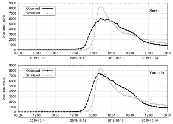 Comparison of the observed and simulated discharge by RRI at the two gauging stations (Senba and Yamada) of Abukuma River Basin for the typhoon Hagibis 2019 case.