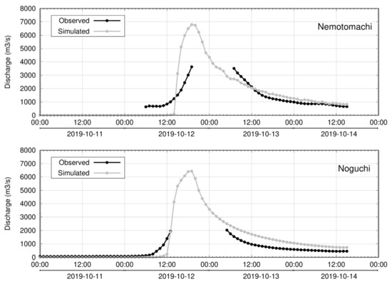 Comparison of the observed and simulated discharge by RRI at the two gauging stations (Nemotomachi and Noguchi) of Naka River Basin for the typhoon Hagibis 2019 case.
