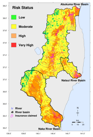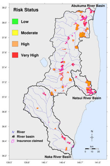 In conclusion, the strong agreement that was found between flood insurance claims data and the developed flood risk categories suggests that the flood susceptibility map could be a valuable tool for flood management and recovery efforts in the aftermath of a flood event. Developing a flood susceptibility map focusing on a specific event could provide practical economic guidance for insurance companies and related industries. Our new approach, which combines hydrological simulation results and other flood causative factors based on the financial aspects within river basins, has shown promising results for the Abukuma, Naka, and Natsui River Basins for the extreme flood event brought by Typhoon Hagibis. The developed flood risk mapping product could serve as a valuable reference for future flood-related planning and decision-making. Additionally, if forecasted rain data, such as 36 h ahead, were available, flood susceptibility mapping could be issued earlier. Future work should improve uncertainties in hydrological analysis and consider finer resolution data for river basins.