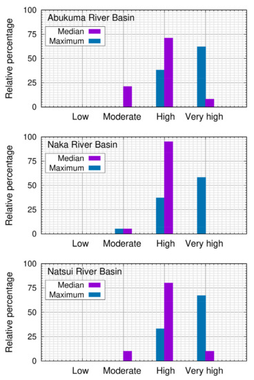 To provide a more quantitative assessment, we calculated each river basin’s relative percentage of flood risk categories. Figure 11 illustrates the relative percentage of flood risk categories within each river basin polygon based on the median and maximum values. As shown, high and very high flood risks were found in most cases. In the Abukuma and Natsui River Basins, over 70% of insurance loss data were associated with high flood risk. The results were more favorable in the case of the Naka River Basin, although a small percentage of loss insurance data was still linked to low flood risk. It is important to note that the insurance loss data are based on postal addresses, and the boundaries of the claimed areas may not always correspond with the actual flood-prone locations.