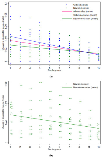 The overall picture of the disposable income distribution in the selected EU countries is split into two groups based on the state of their democracy. In general, our results are congruent with prior studies suggesting that income inequality is being quite well handled by the COVID-19 containment measures [3,25,27]. Indeed, the mitigating effects of the simulated measures are regressive, showing a greater influence on the bottom part of the income distribution (see Figure 1a). The containment measures increased the disposable income of households in the first decile groups (low-income households) much more than that of higher decile groups (high-income households). In addition, one can observe that the degree of inequality and the effects of the COVID-19 containment measures vary by the state of democracy. Generally speaking, old democracies benefit from these measures to a greater extent than new democracies. While within both new and old states of democracy a regressive trend of the COVID-19 containment measures effects is seen from the bottom to the top of income groups, the trend among old democracies is steeper. An interesting switch happens in the upper-income groups. Namely, in the two highest decile income groups, the effects of the COVID-19 containment measures become greater in new democracies, albeit they remain very low. A more detailed distribution of the change in disposable income due to the COVID-19 containment measures by country is shown in Figure 1b,c.