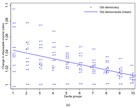 (a) Effect of the COVID-19 containment measures on disposable income by household income decile groups and democracy. (b) Effect of the COVID-19 containment measures on disposable income by household income decile groups and new democracies; (c) Effect of the COVID-19 containment measures on disposable income by household income decile groups and old democracies.
