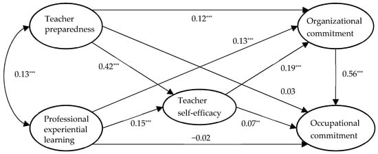 The results suggest that teacher preparedness and professional experiential learning were directly related to organizational commitment (β = 0.12, p < 0.001; β = 0.13, p < 0.001), but there were no significant associations with occupational commitment. Nevertheless, they had stronger relationships with teacher self-efficacy (β = 0.42, p < 0.001; β = 0.15, p < 0.001), which also significantly connected with commitment to the organization and occupation (β = 0.19, p < 0.001; β = 0.07, p < 0.01). Additionally, organizational commitment was positively related to occupational commitment (β = 0.56, p < 0.001).