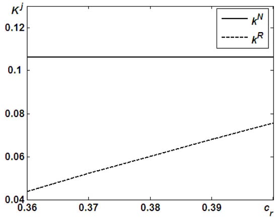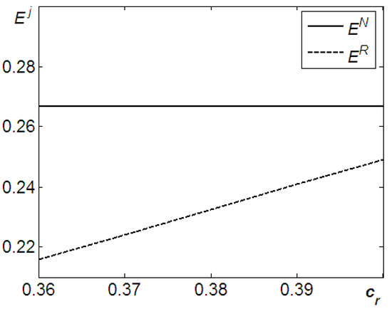 We explain the intuition behind this result as follows. Based on the outcomes in Table 3, we can conclude that, under the remanufacturing scenario, the optimal sales volume of the improved product increases with the remanufacturing cost, that is, . This is consistent with the intuition that, as the remanufactured cost increases, lesser quantities of remanufactured products become availed to the market (i.e., ), which enlarges the potential market for the new, improved products. Recall that the sales price for the improved version remains the same, irrespective of whether any remanufactured product is available. Thus, as the remanufacturing cost increases, the increased sales volume of the improved products prompts the “prizes” of product innovation to increase. Then, as illustrated in Figure 2, as the remanufacturing cost increases, the incentives for new product innovation under the remanufacturing scenario also increase, resulting in the difference between the incentives for new product innovation among both models decreasing.