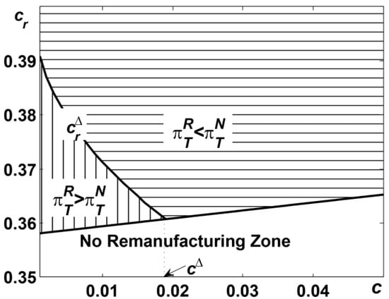 In sum, we can conclude that the profits under the remanufacturing scenario are higher than that of no remanufacturing (i.e., ) if, and only if, the cost of is not pronounced (i.e., ); otherwise, the opposite is true.