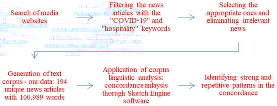 We conducted a search of media websites to generate a body of media articles for corpus linguistics analysis for the purpose of identifying challenges that Australian tourism and hospitality businesses faced in the early stages of the COVID-19 crisis and innovative responses developed by business leaders. News media content was selected as the data source because it provided the latest organisational information and first-hand information from business leaders in the midst of the crisis that we could not otherwise obtain [40,73]. The media content included interviews with business owners, managers, employees and other stakeholders (e.g., representatives of industry associations) providing first-hand insights of owners and leaders on leadership and innovation in the tourism and hospitality industry during the first months of the crisis. Figure 1 illustrates the process of data collection and analysis.